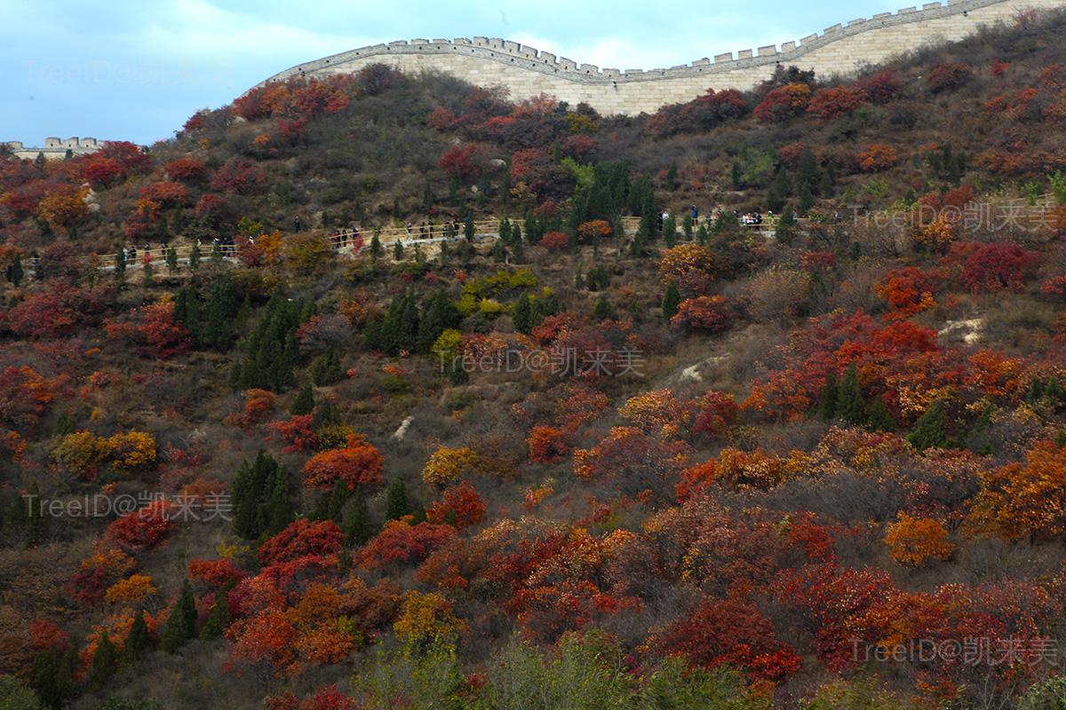 该游览步行道因有黄栌林掩映,金秋时节万叶飘丹、赤红如火而得名。林间小径上红叶夹道相迎,微风吹过,红涛泛波,有如走在似锦途程上,令人豪情倍增、壮志激昂。路侧残长城静默依陪,使人流连忘返,确实不虚此行。