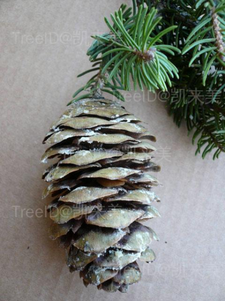 球果矩圆状圆柱形或卵状圆柱形,长8-14厘米,径宽5-6.5厘米,成熟时淡褐色或褐色;种鳞宽大;苞鳞短小。