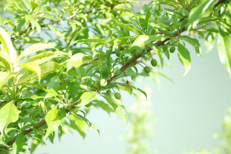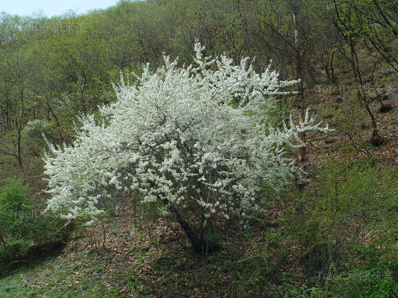 叶倒卵形,边缘有细密锯齿。花先叶开放,通常3朵簇生;花瓣白色。核果卵球形,基部凹陷,绿色、黄色或浅红色,有光泽,外有蜡粉。