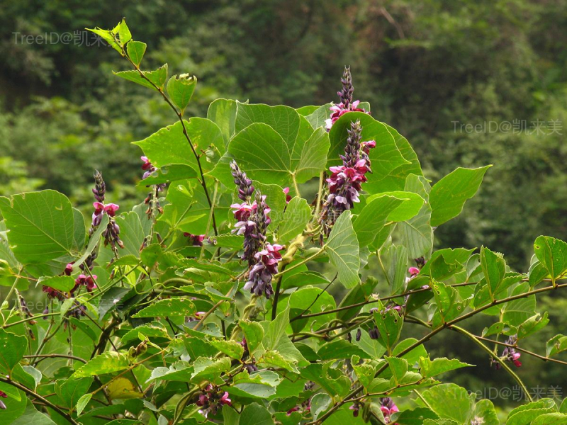 羽状复叶具3小叶;小叶全缘或3浅裂,顶生小叶宽卵形,长7-15厘米,侧生小叶斜卵形,稍小。总状花序长15-30厘米,中部以上多花密集;花冠紫色。荚果长椭圆形,长5-9厘米,扁平,被褐色长硬毛。