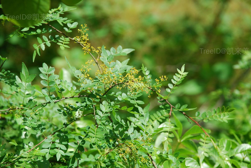 羽状复叶,叶轴两侧有狭翅,背面常生小皮刺;小叶11-17,卵形,下面中脉常有细小皮刺。聚伞状圆锥花序;花小,花被片5-8。蓇葖果球形,熟时紫红色,有凸起的腺点。