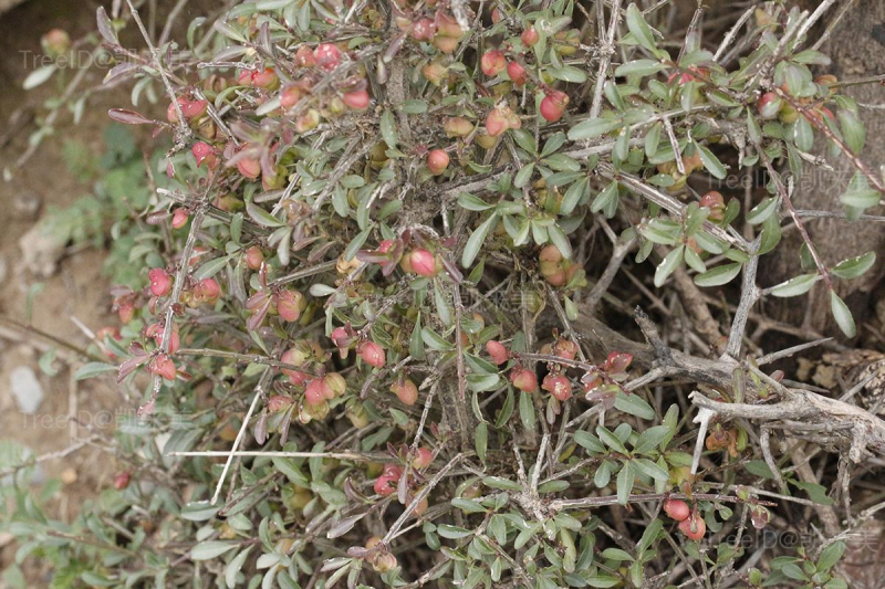 单叶对生,椭圆披针形至窄长椭圆形,长1-2厘米,宽2-8毫米;叶柄极短。聚伞花序有花1-2朵;花黄绿色,4数。蒴果,近圆球状,上部1-4浅裂;种子紫褐色,假种皮橙色,全包种子。