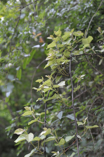 叶卵圆形或卵状五角形,长4-12厘米,宽3-8厘米,基部心形或微心形,边缘具尖锐锯齿,下面密被灰色或褐色绒毛;叶柄长2.5-6厘米;托叶膜质,卵披针形。