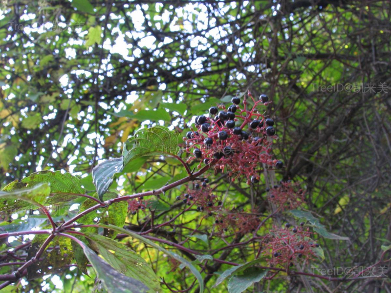 核果蓝黑色至黑色,近于球形,直径4-5毫米,密被贴生短柔毛。