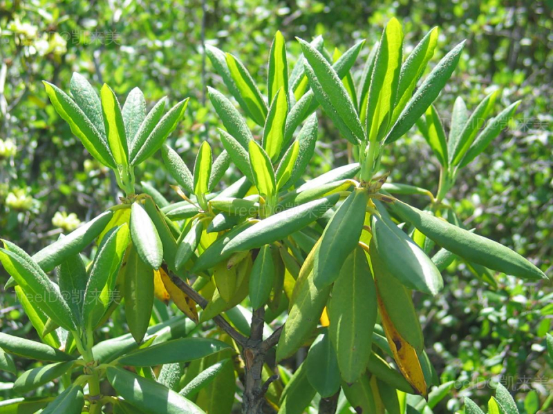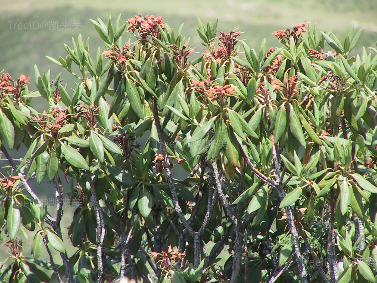 叶革质,椭圆形至长圆状卵形,长6.5-11厘米,宽3-5厘米,先端具短小尖头,边缘稍反卷,下面密被锈色毛;叶柄粗壮,长1-1.5厘米。