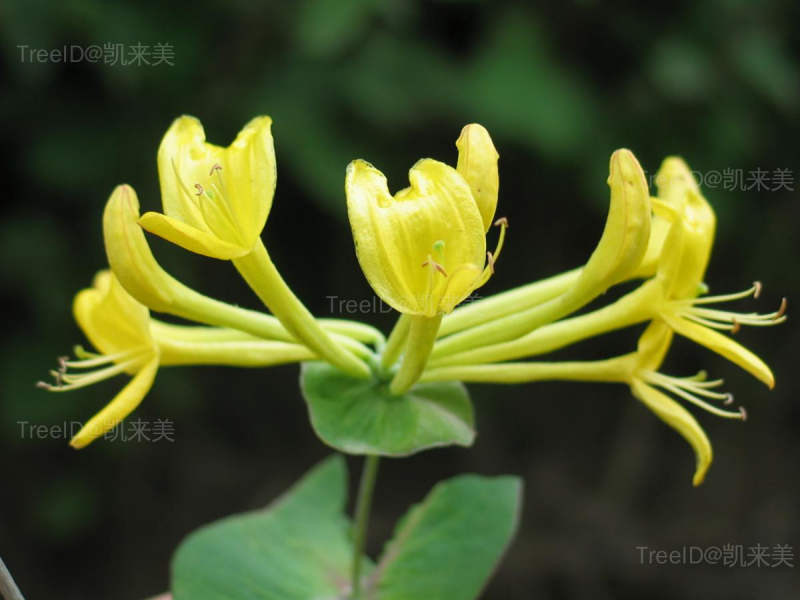 叶矩圆形或卵状矩圆形,长5-12厘米,下面被短糙毛,花序下方1-2对叶连合成近圆形的盘;叶柄极短或近无。3朵花组成的聚伞花序密集成头状花序生小枝顶端,共有6-9朵花;花冠黄色至橙黄色,长5-9厘米,唇形。果熟时由黄色转红黄色,最后变深红色,近圆形,直径约1厘米。