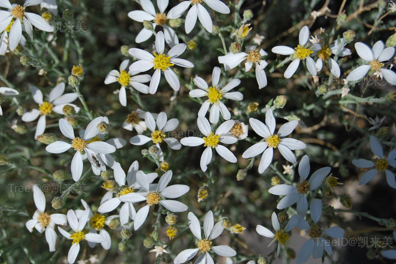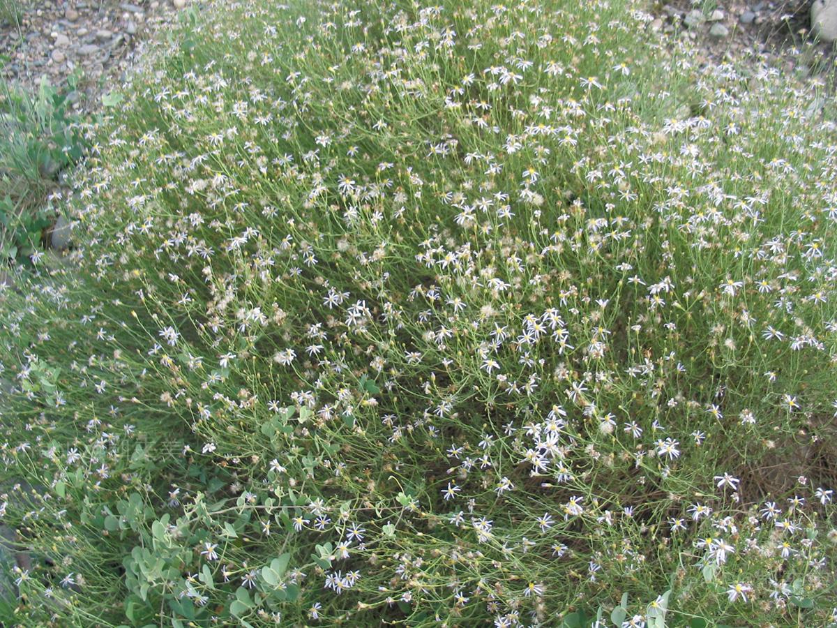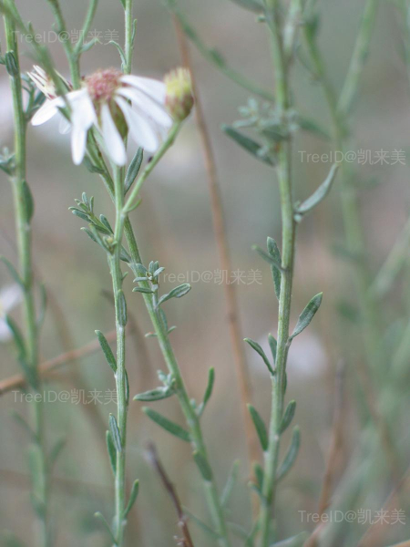 叶较密集,长圆状线形或近线形,长12-15毫米,宽1.5-2毫米,两面被绒毛。头状花序较大,长8-10毫米,宽约10毫米,在茎枝顶端排成疏散的伞房花序。舌状花7-10个,舌片淡紫色;管状花黄色。