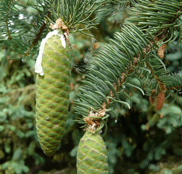树皮灰褐色,不规则块状脱落。叶四棱状条形,螺旋状排列。球果长圆柱形,当年成熟,下垂。