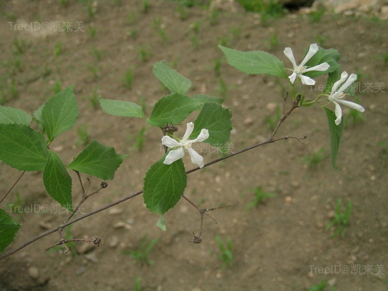 单叶对生,菱状卵形,边缘具不规则细锯齿,两面均有星状毛,并具中央射线。花常1-3朵,聚伞状;萼裂片5,密被星状毛,花瓣5,白色,雄蕊花丝上部有2钩状齿。蒴果扁球形,具宿存萼片。