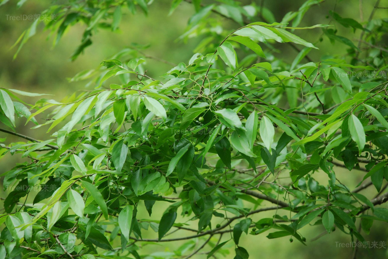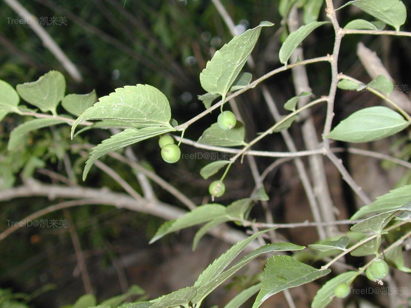 叶卵形或卵状披针形,先端渐尖或尾尖,基部偏斜或近圆形,中上部边缘具锯齿,有时近全缘。核果单生叶腋,球形,熟时紫黑色,果柄较长。