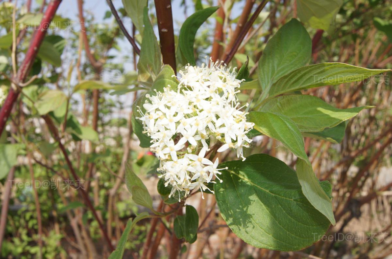 叶对生,卵形至椭圆形。 伞房状聚伞花序顶生;花小,黄白色。 核果斜卵圆形,成熟时白色或稍带蓝紫色。