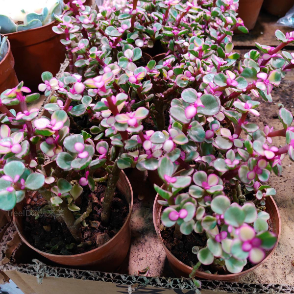 植株具肉质茎。株高3~4米,肉质叶倒卵形,交互对生,新叶的边缘有红(粉红)晕,在阳光充足时尤为明显,后随着叶片的长大,红晕逐渐后缩。叶片大部分为黄白色,只有中央的一小部分为淡绿色;小花淡粉色。