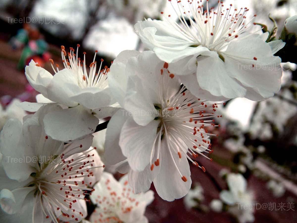 花白色,花蕾卵形,花瓣卵形,长1.83厘米,花径4.3厘米,复瓣,梅花型,花瓣数18枚(16-23);雄蕊数平均73.5,花丝长1.83厘米,雄蕊与花瓣近等长,花药黄色;无雌蕊;着花密;花梗长0.53厘米;萼片绿色,两轮,卵状;花丝和萼片均有瓣化现象。花期在所有桃花品种中最早,在北京地区4月上旬即可盛花。