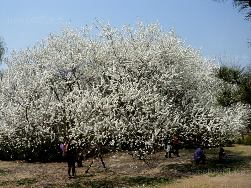 树皮光滑,深灰色或暗红褐色。小枝细长,黄褐色。花白色,花蕾卵形,花瓣卵形,复瓣,梅花型。叶绿色,椭圆披针形;叶缘细锯齿。